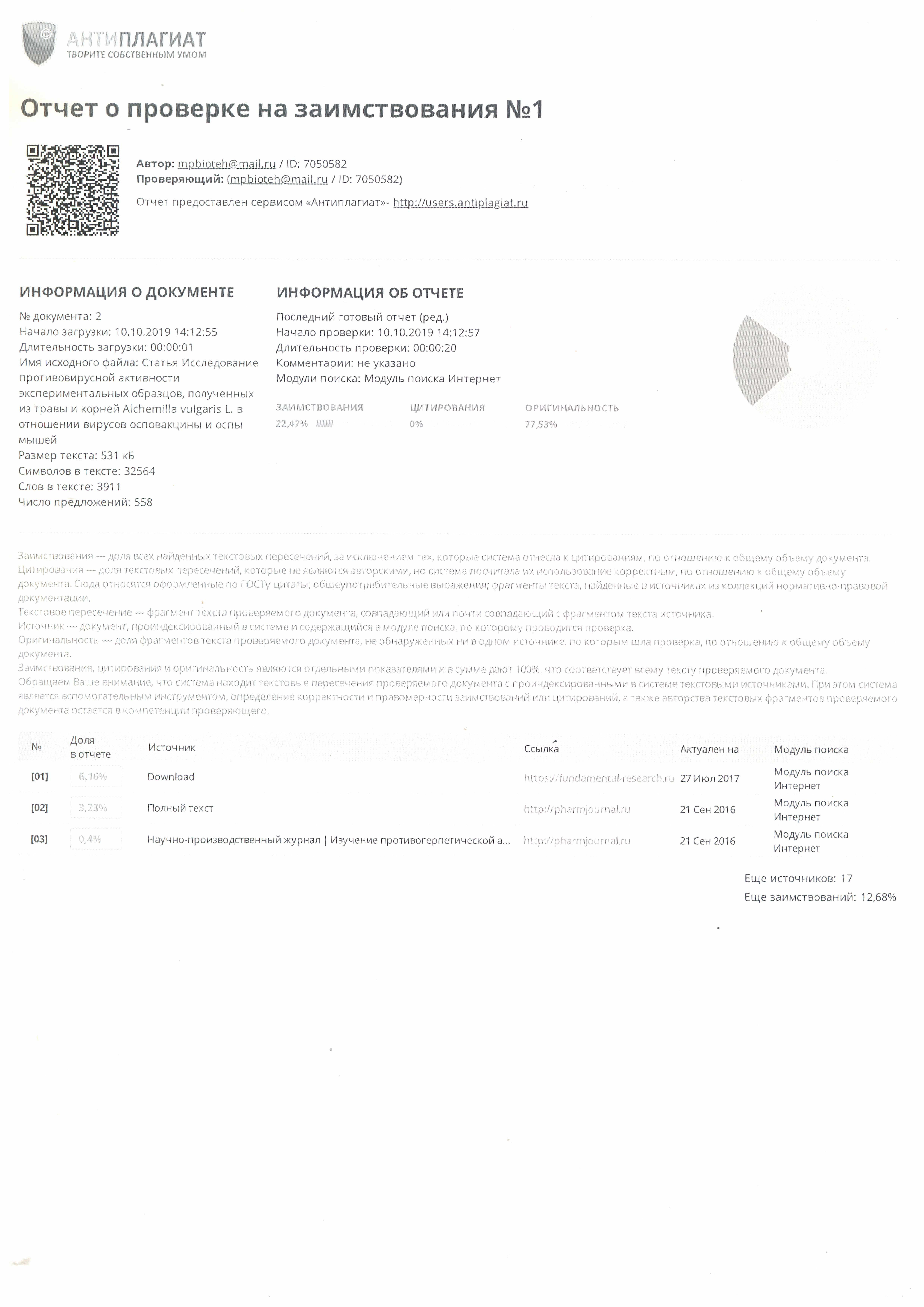 Заключение. Таким образом, очищенные этилацетатные экстракты из корней и этанольные экстракты из сырой массы травы Alchemilla vulgaris проявляют противовирусную активность в отношении ортопоксвирусов in vitro.