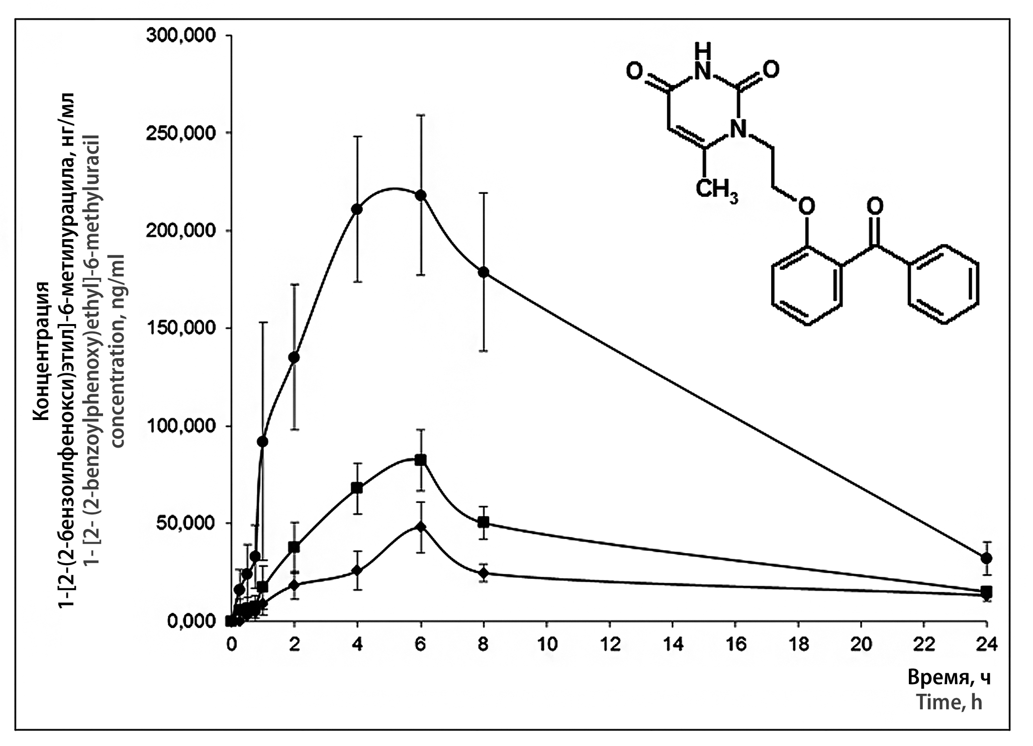 Результаты и обсуждение. Разработана методика количественного определения 1-[2-(2-бензоилфенокси)этил]-6-метилурацила в плазме крови кроликов методом ВЭЖХ; методика валидирована в диапазоне концентраций 10–720 нг/мл в соответствии с современными требованиями и удовлетворяла им по всем показателям. С применением разработанной методики выполнен анализ образцов плазмы крови, полученных от лабораторных животных после однократного перорального введения субстанции и твердых дисперсных систем (ТДC) на ее основе в дозе 10 мг/кг. На основании полученных результатов по концентрациям 1-[2-(2-бензоилфенокси)этил]-6-метилурацила в плазме крови проведен расчет основных фармакокинетических параметров исследуемых объектов. Установлено, что наибольшей относительной биодоступностью из исследованных объектов обладает ТДС с Kollidon 17PF, ее относительная биодоступность по отношению к субстанции при пероральном введении составила 583 %.